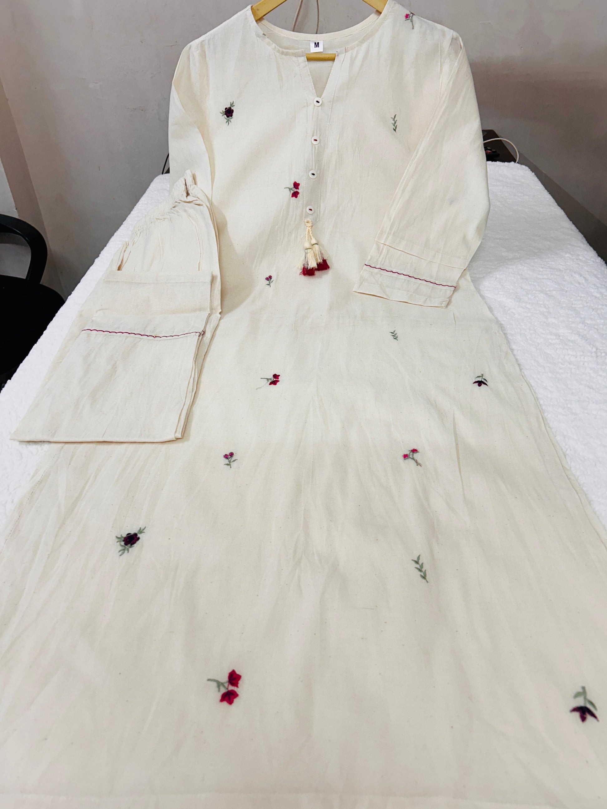 Experience refined comfort and elegance with this Floral Embroidered Regular Pure Cotton Kurta paired with matching trousers. Crafted from breathable, high-quality pure cotton, this ensemble ensures lasting comfort while keeping you cool. The intricate floral embroidery adds a sophisticated touch, making it suitable for both casual and semi-formal occasions. Designed with a regular fit, it offers ease of movement and a flattering silhouette. Perfect for those seeking traditional style with modern comfort.